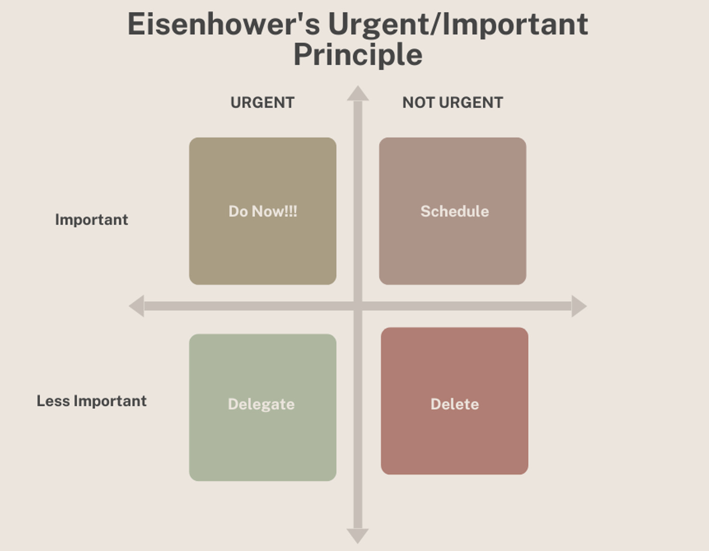 Eisenhower's Urgent/Important Principle is a practical tool for managing time and prioritizing tasks effectively. Through it you can categorize tasks into four quadrants based on urgency and importance. By focusing on tasks that are both urgent and important, you can identify what needs your immediate attention. Simultaneously, planning for activities that are important but not urgent helps in proactive and strategic thinking, fostering long-term success. This principle encourages a balanced approach to time management, preventing you from solely reacting to urgent matters while neglecting important but less pressing tasks.